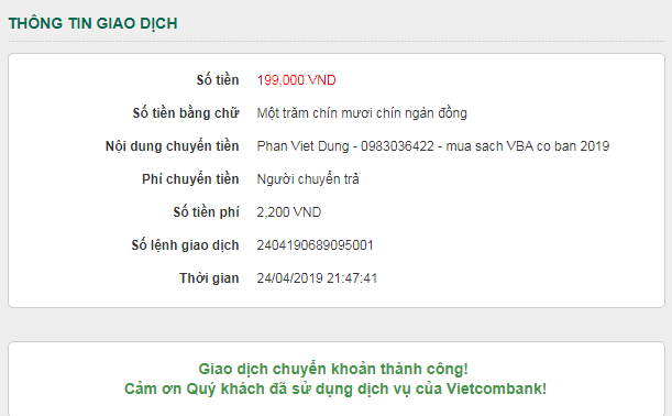 với Nội dung chuyển khoản: "Họ tên - SĐT - mua sách VBA cơ bản 2019"