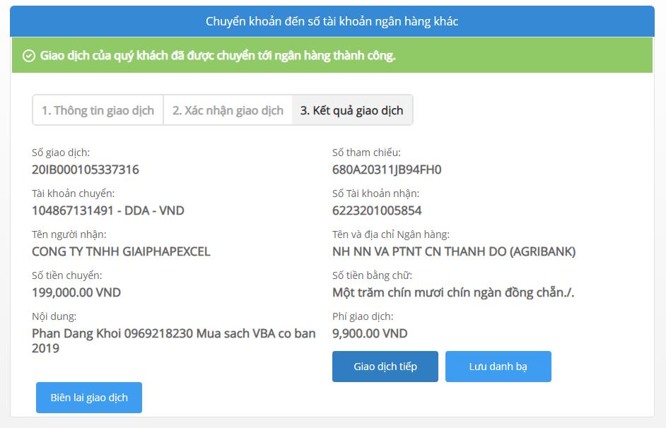 Mình đã chuyển khoản vào Agribank CN Thành Đô, Q.1, TP.HCM -Mua 2 quyển VBA cơ bản và nâng cao.