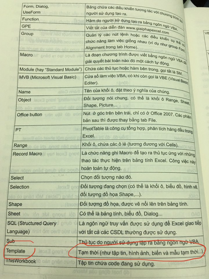 Tối hôm qua em thử dùng kỹ thuật scan lướt bằng mắt thường của em hơn 300 trang sách vẫn chưa phát hiện ra chữ Template này nằm ở đâu trong sách, hic, em tìm tới để xem ngữ cảnh nó như thế nào. Có lẽ do em chưa đoán được từ này sẽ nằm trong bài nào chương nào nên dò chưa kỹ chưa ra, và cũng có thể từ Template này thầy dùng bên quyển VBA nâng cao cũng nên, chắc 2 quyển xài chung Bảng Từ viết tắt và thuật ngữ. Ngoài từ Template này ra, các từ còn lại em thấy... bình thường.