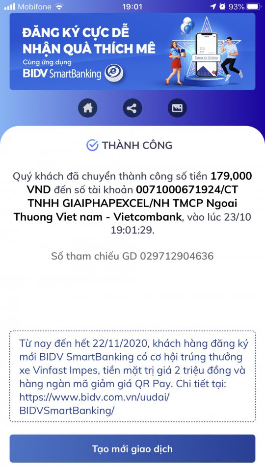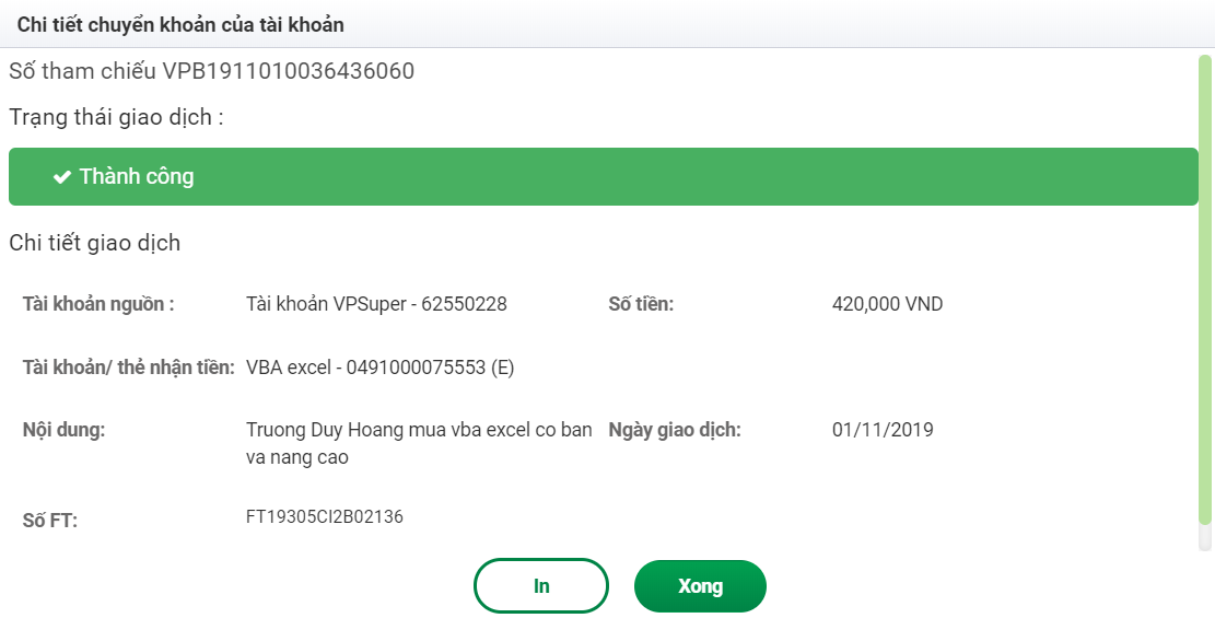 Mình đã chuyển khoản vào Ngân hàng Vietcombank - PGD Bến Nghé, Q.1, TP. HCM (CN TPHCM). -Mua 2 quyển VBA cơ bản và nâng cao.