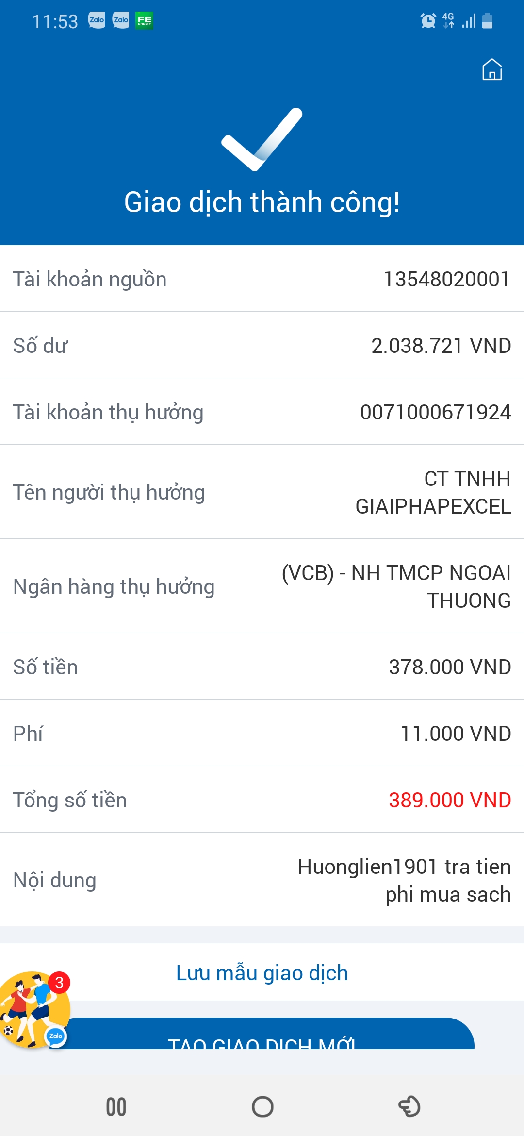 Em đã ck theo số tk vietcombank 0071000671924 là 378k theo ghi chú huonglien1901 thanh toan tien sach vba. Nhờ Anh chị kiểm tra giúp em.Screenshot_20191114-115339.jpg