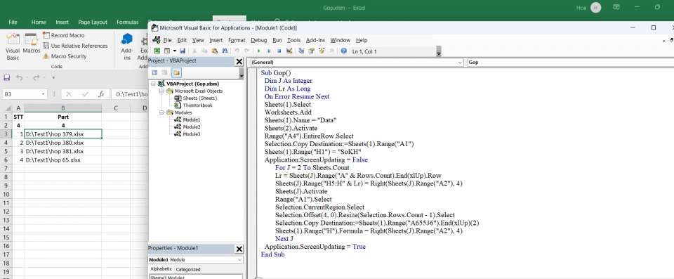 Em đang có code để gộp nhiều sheet thành 1 Sheet. Nhưng hiện tại e có rất nhiều file giống như vậy, Để ko phải mở từng file 1 chạy code. Em muốn chạy theo danh sách trong file tổng, nhưng em vẫn chưa biết cách để sửa. Mọi người xem giúp em với ạ.