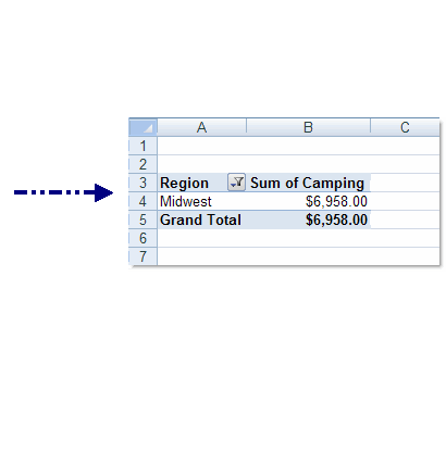 Bạn sẽ thấy ở bên phải của tiêu đề Region trong vùng báo cáo (ô A3) có một nút mũi tên xổ xuống (drop-down arrow). Nút này có chức năng tương tự chức năng AutoFilter. Nhấn vào đó, bạn có thể lựa chọn những mục muốn xem thuộc danh sách Region, mà mặc định của nó là Select All (xem tất cả). Ví dụ, bạn chỉ muốn xem doanh thu dụng cụ cắm trại của riêng miền Midwest mà thôi, bạn nhấn vào nút này, nhấn vào mục (Select All) để tắt nó đi, rồi nhấn vào mục Midwest, bạn sẽ có kết quả như hình sau: