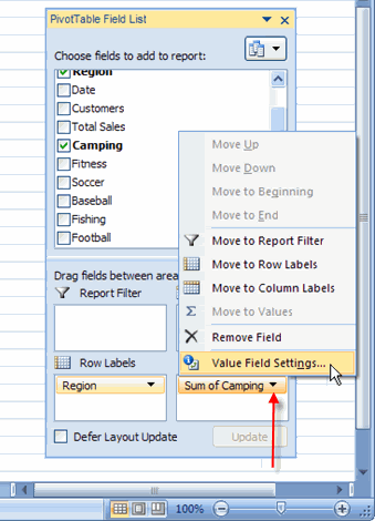 Cuối cùng, bạn nhấn vào cái mũi tên bé tí nằm ngay bên cạnh mục Sum of Camping trong khung Values, chọn Value Field Settings trong danh sách mở ra.