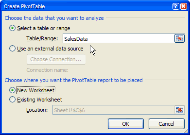 Excel sẽ hiển thị hộp thoại Create PivotTable như hình sau đây: